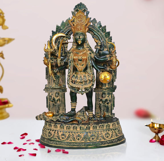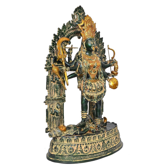 Invoke the divine strength of the powerful Goddess Mahakali with this stunning brass idol. Standing at 28 inches tall, her fierce form exudes courage and protection. A beautiful addition to any home, this idol is a symbol of patriotism and devotion. May she bless you with blessings and prosperity.