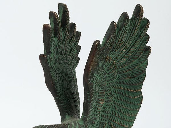 This 8-inch brass eagle sculpture features a distinctive green Patina finish, exemplifying superior metallurgical craftsmanship. The verdant patination creates a sophisticated antique aesthetic while highlighting the intricate feather detailing and powerful stance. Each piece exhibits unique coloration variations inherent to authentic patination processes, making it both a collector's item and an elegant statement piece for discerning interiors.