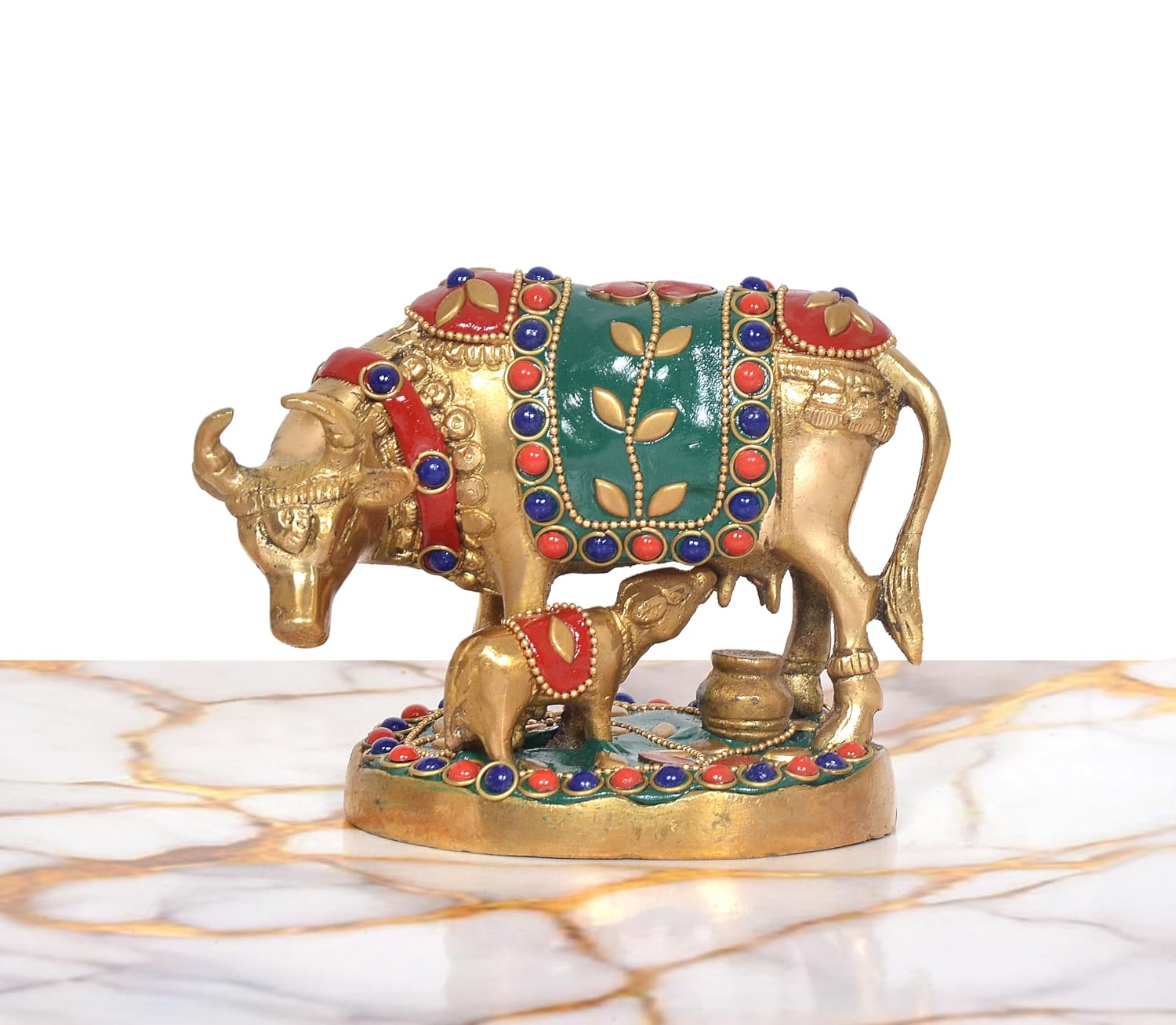 Bronze Kamdhenu Cow with Calf Idol (Height: 4 Inch)