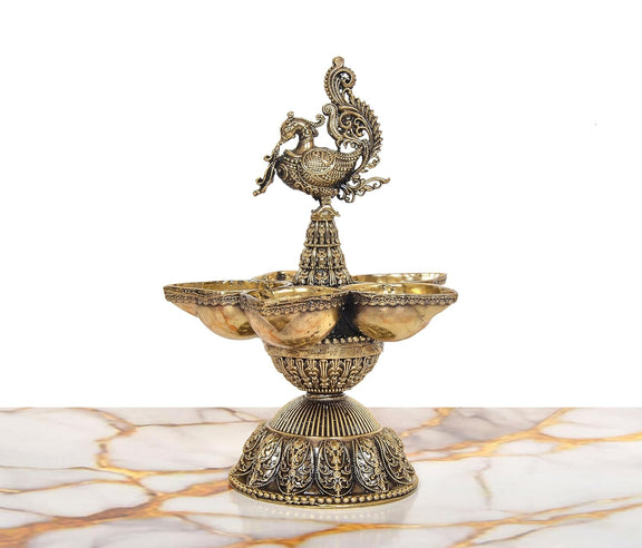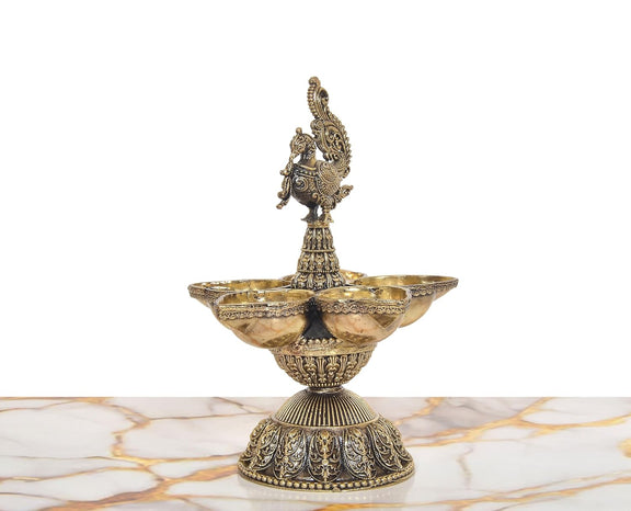 Illuminate your home with the timeless elegance of this exquisite bronze oil lamp, beautifully crafted in the shape of a graceful peacock. Standing at 6.5 inches tall, this five-diya stand brings warmth and spiritual grace to any space. Perfect for festivals, prayers, or everyday moments of reflection, each flame dances with the charm of traditional craftsmanship. Let this beloved piece become a cherished part of your home, spreading light and love through its radiant glow.