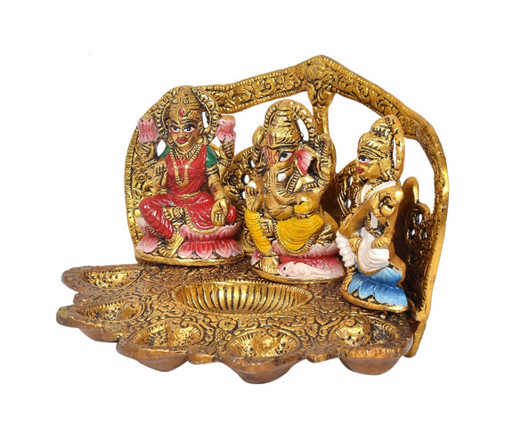 Metal Laxmi Ganesh Saraswati Idol Diya Oil Lamp Deepak with Hand Painting (Height: 5 Inch)