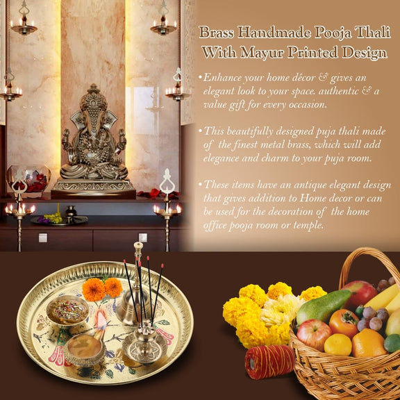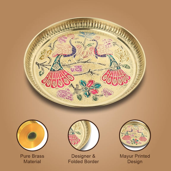- This brass thali has engraved printed peacock design. It comes in a box packing.