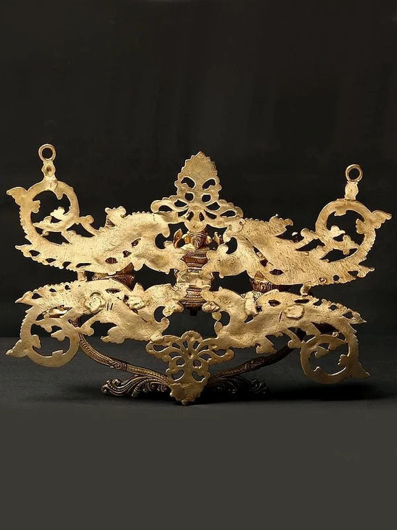 Transform your living space with our Alluring Lakshmi, Ganesha, and Saraswati Wall Hanging. Made of brass, this 14 inch hanging features intricate designs and a dipam, creating a divine ambiance. Invite good luck and prosperity into your home with this stunning piece, a must-have for any spiritual space.