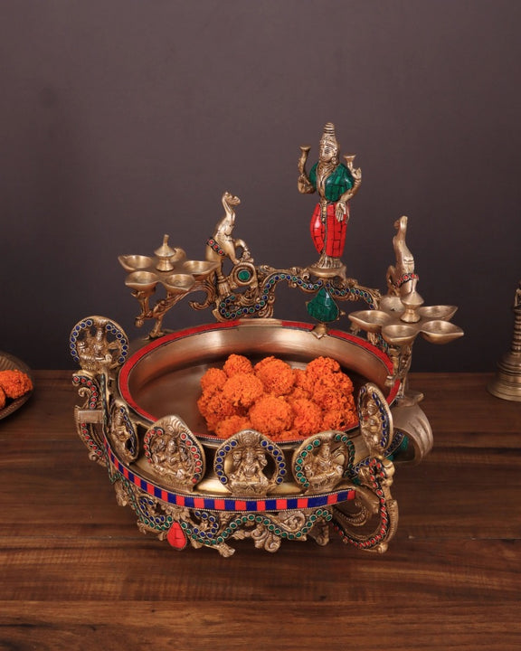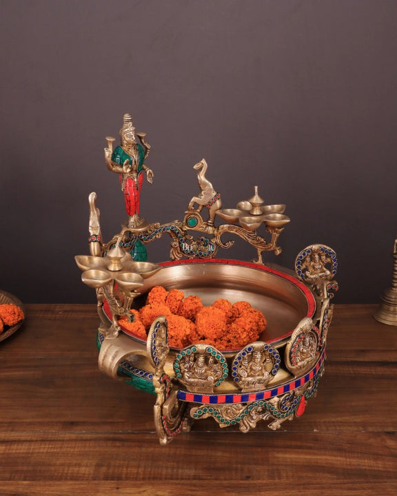 Ashtalakshmi Brass Urli with Diyas (Height: 16 Inches)