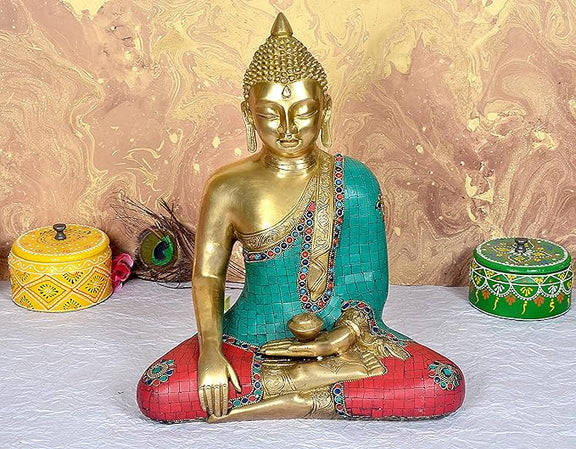 Embody peace and enlightenment with our Bhumisparsha Mudra Brass Buddha Idol Statue Murti. Standing at an impressive height of 15 inches, this intricate brass statue exudes luxury and sophistication. Invite a sense of calm and serenity into your space with this exclusive piece, celebrating the art and wisdom of Buddhism.