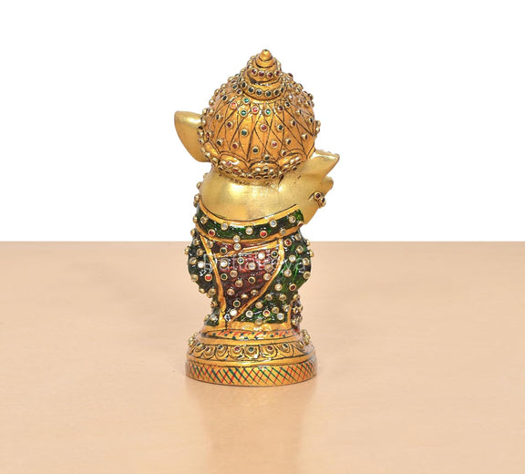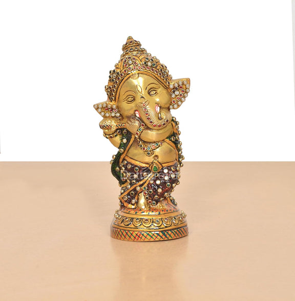 Invite blessings and positive energy into your space with this captivating standing brass Ganesha idol. This beautifully crafted statue shows Lord Ganesha in a graceful standing pose, decorated with vibrant gemstone embellishments that highlight his divine form. The intricate details and bright golden finish make this piece a magnificent addition to any setting. Lord Ganesha, the respected Hindu deity of wisdom, prosperity, and the remover of obstacles, is perfectly captured in this elegant idol. It's ideal for your Pooja room, office desk, or as a striking accent in your living area. This Hindu religious idol is a strong symbol of good fortune and new beginnings. Made from high-quality brass, this Ganesha statue is both sturdy and visually stunning. It makes an exceptional spiritual gift for loved ones on occasions like housewarmings, Diwali, or other celebrations. Improve your Indian home decor with this exquisite and meaningful brass Ganesha.