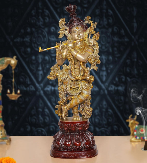 Brass Big Size Lord Krishna Idol Playing Flute (Height 37 Inch)