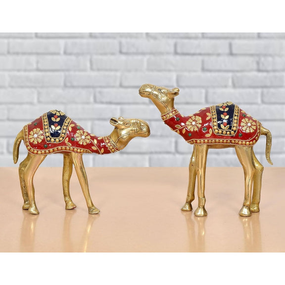 This stunning pair of brass camel figurines stands at a height of 7 inches. A perfect addition to any home, these beautifully-crafted showpieces showcase intricate details and boast a patriotic touch, making them a great gift for any occasion.