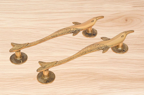 Add a touch of elegance and warmth to your home with this beautiful pair of brass door handles, featuring a graceful dolphin fish design. Standing 12 inches tall, these handles combine artistic charm with sturdy craftsmanship, making every entrance feel inviting and special. Perfect for those who cherish unique, heartfelt details in their living space.