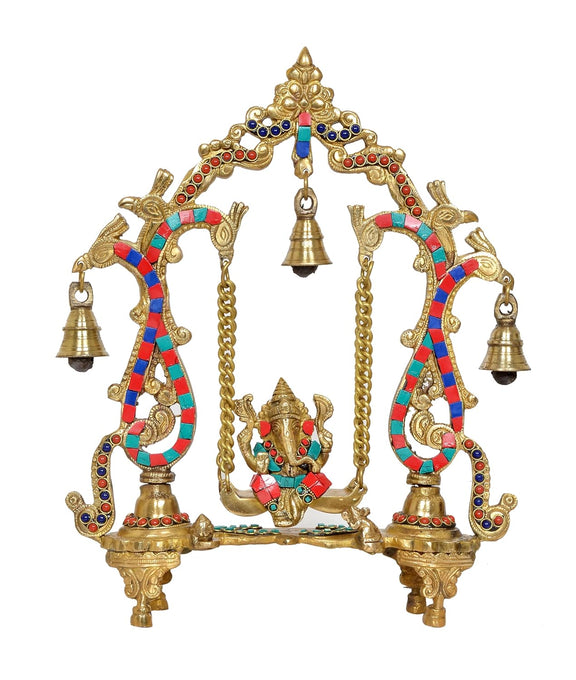 Brass Ganesha Playing On Swing Ganesha Jhula Decorative Showpiece Multicolour for Home Decor Mandir Pooja Temple (Height 14 Inch)