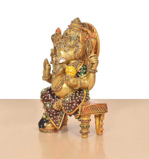 Brass Ganesha Statue Sitting On Chowki (Height 8 Inch)