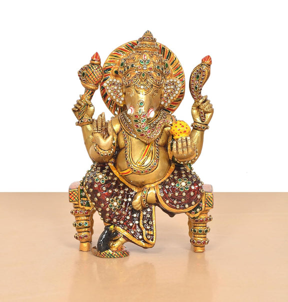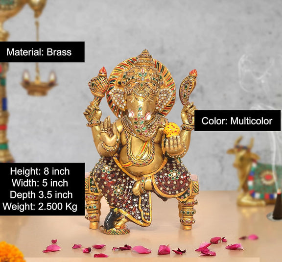 Elevate your space with this beautiful handcrafted brass Ganesha idol. This stunning statue shows Lord Ganesha seated on a throne. The detailed design brings his divine presence to life. Adorned with vibrant gemstone work, this idol has a radiant golden finish and is truly a work of art. As the remover of obstacles and the god of new beginnings, Lord Ganesha is a beloved figure in Hinduism. This beautifully crafted religious idol is perfect for your Pooja room, living room, or office. It symbolizes wisdom, prosperity, and good fortune. Made from high-quality brass, this Ganesha statue is both durable and elegant. It makes a thoughtful and meaningful spiritual gift for housewarmings, festivals like Diwali, or any special occasion. Add a touch of tradition and spirituality to your home with this exceptional piece of Indian decor.