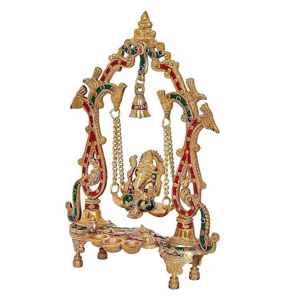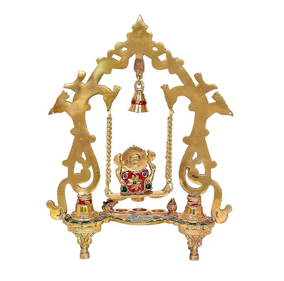 Brass Ganesha Swing Statue with Diya Statue Swing Ganesh Idol, Jhula Ganesh Murti (Height: 14 Inches)