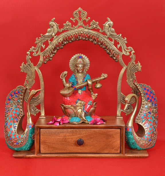 Brass Maa Saraswati Religious Statue with Stone Work (Height: 10 Inches)