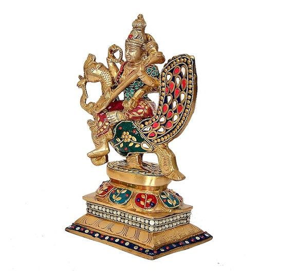 Elevate your study space with our exquisite Brass Goddess Saraswati figurine, symbolizing knowledge and wisdom. Standing at 11.5 inches, this exclusive Maa Saraswati sculpture sitting on a swan exudes elegance and refinement. Handcrafted with intricate details, it adds a touch of sophistication to any room.