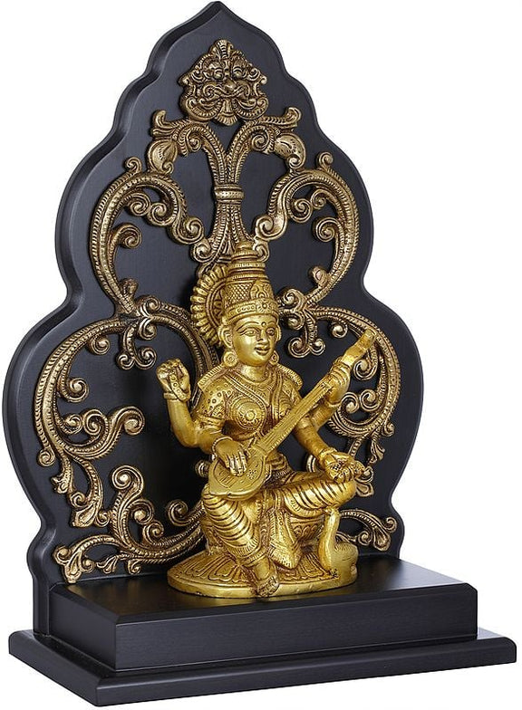 Brass Goddess Saraswati Statue Seated on a Kirtimukha Chowki 12 inches