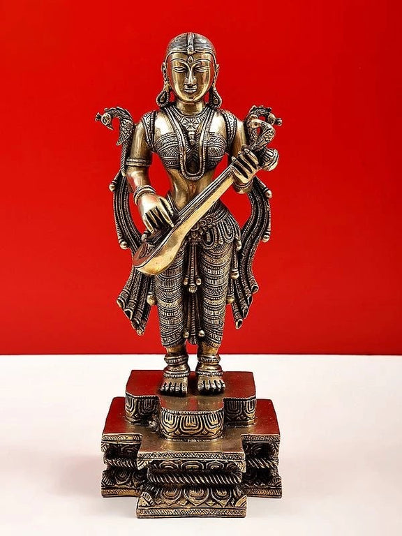 Brass Handmade Standing Devi Saraswati, 14 inches.