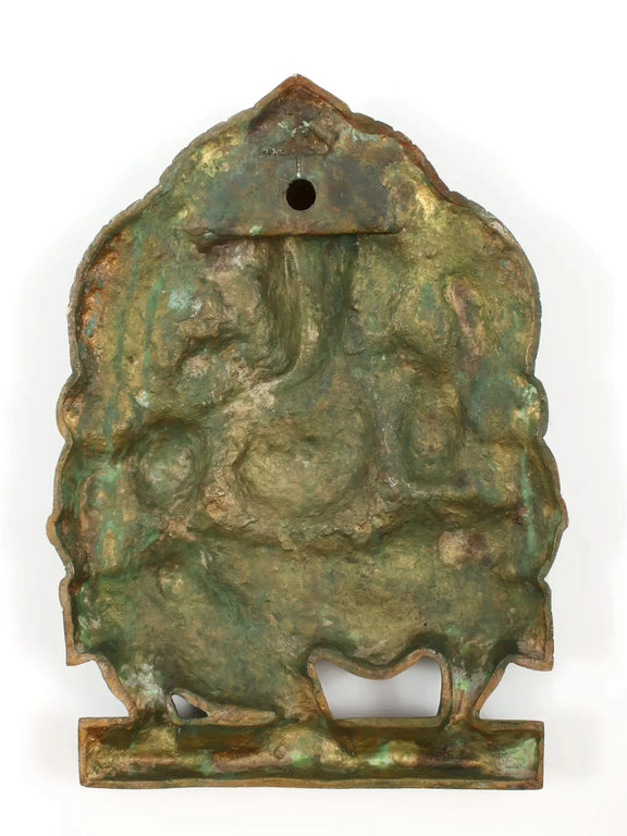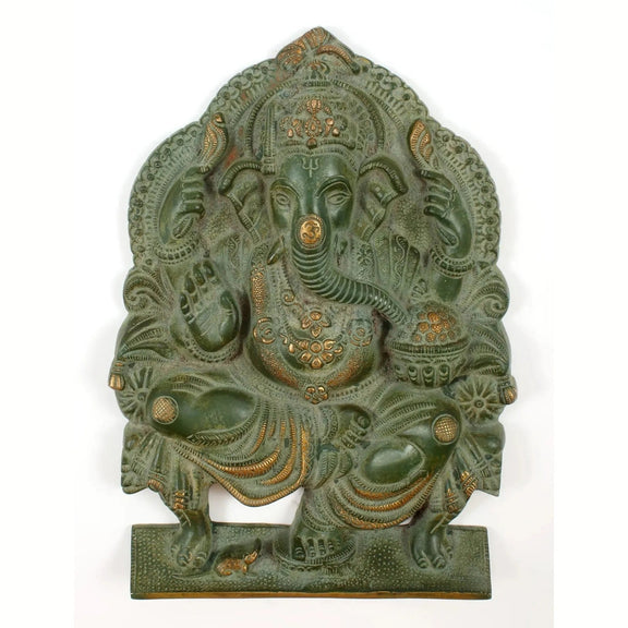 Brass Green gold Idol of Lord Ganesha Seated on a Throne, Bestowing Blessings 11 inches