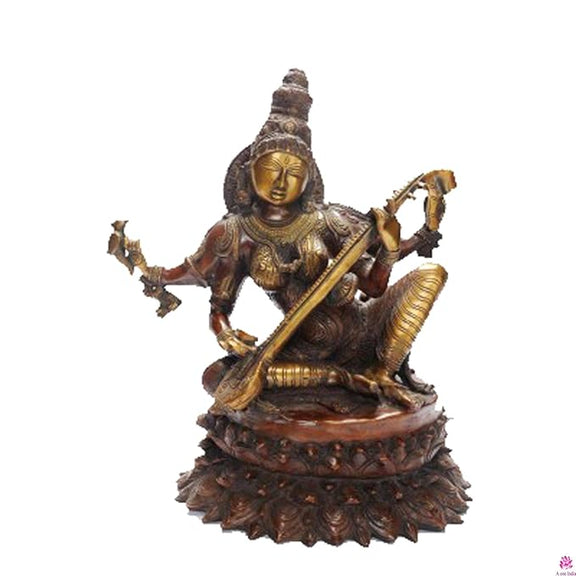 Introducing our stunning Brass India Goddess Saraswati, measuring at 45.72cm x 30.48cm. Expertly crafted with a gleaming copper orange polish, this piece exudes luxury and sophistication. Embodying the Hindu goddess of knowledge, music, and art, this statue is a symbol of prosperity and creativity. Elevate your space with this exclusive masterpiece.