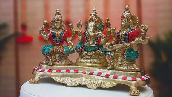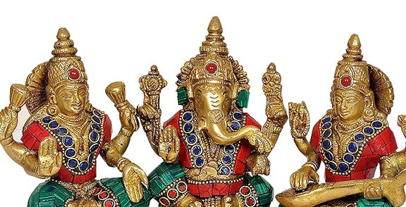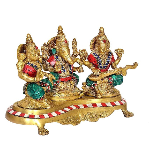Brass Lakshmi Ganesh Saraswati Statue (Height: 6.5 inches)