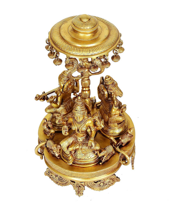 Brass Lakshmi, Ganesha and Saraswati Seated on Rotating Chowki with Parasol Idol (Height: 14 Inch)