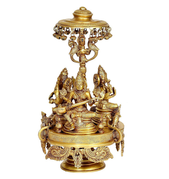 Celebrate divine blessings with this exquisite 14-inch brass idol featuring Lakshmi, Ganesha, and Saraswati seated gracefully on a rotating chowki beneath a parasol. Perfect for your home altar, this beautifully crafted piece invites prosperity, wisdom, and harmony into your space, making every prayer a heartfelt experience. Its rotating base allows you to admire every intricate detail, enhancing your spiritual connection with these revered deities.