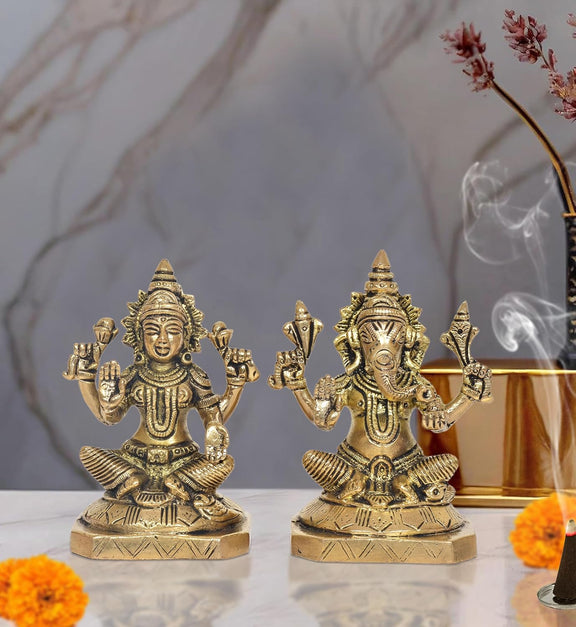 Brass Laxmi Ganesh Statue - Handcrafted Goddess Lakshmi and Lord Ganesha Idol for Home Decor and Pooja (Height 5 Inch)