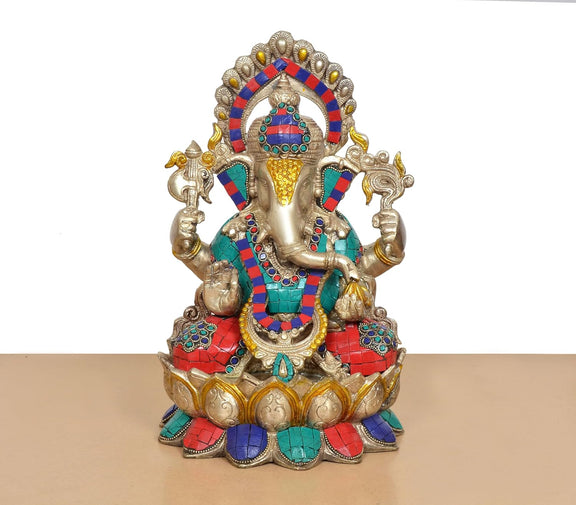 Brass Lord Ganesha Sitting On Lotus (Height: 12.5 Inch)
