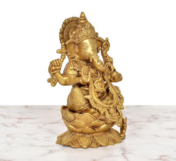 Brass Lord Ganesha Sitting On Lotus Sculpture (Height 9.5 Inch)