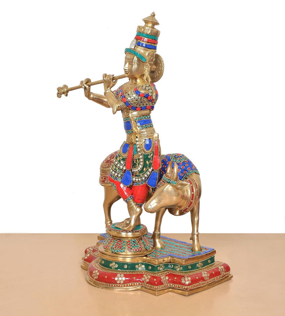 Brass Lord Krishna with Cow Idol (Height 25 Inch)