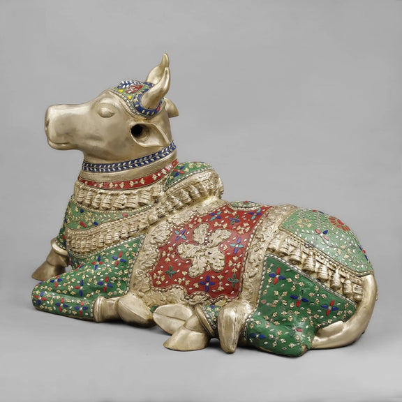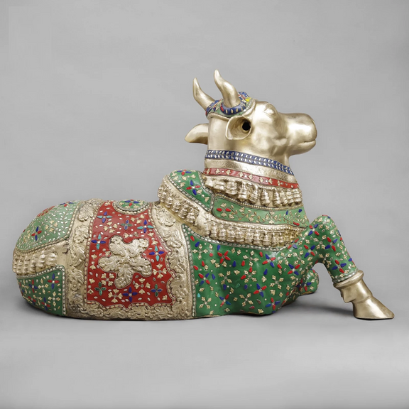 Brass Nandi Seated Floral Stone Work Sculpture (Height: 22 Inches)