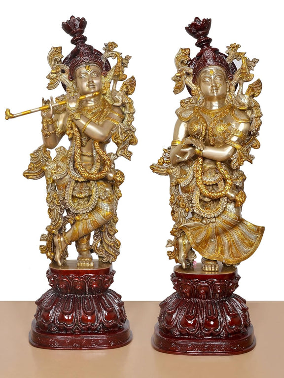 Bring home the divine presence of Radha Krishna with this stunning 37-inch brass idol. The intricate detailing of the idol is sure to captivate your senses and fill your home with positive vibes. Adorn your living space with this masterpiece and experience the love and blessings of the divine couple.