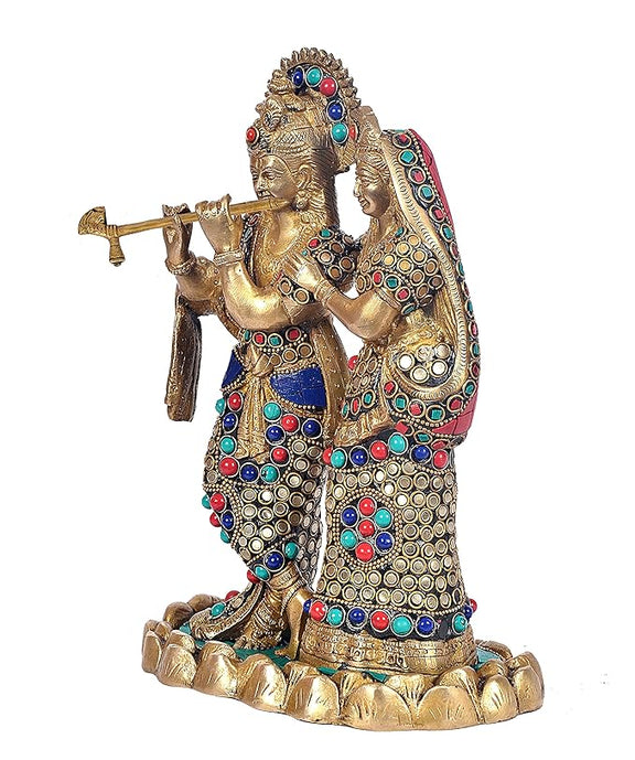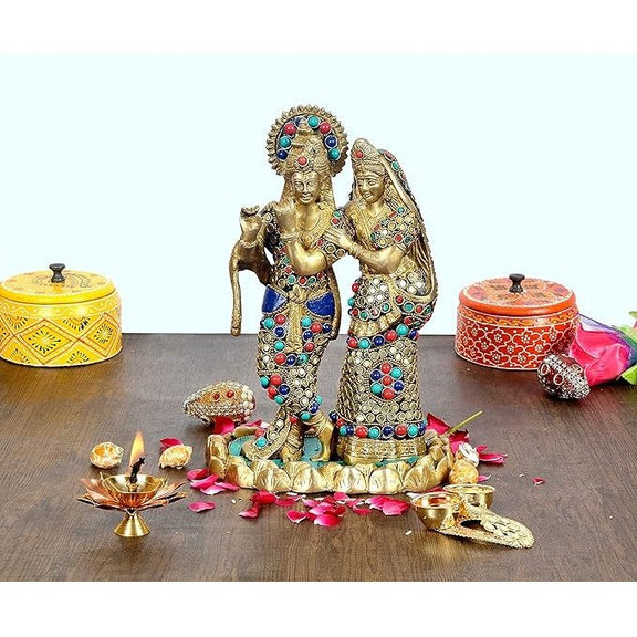 This exquisite 11-inch brass Radha Krishna statue boasts intricate inlay work and evokes a sense of divine beauty and spirituality. Handcrafted with precision, this religious statue is a symbol of grace and devotion. Elevate your home decor with this luxurious and exclusive piece.