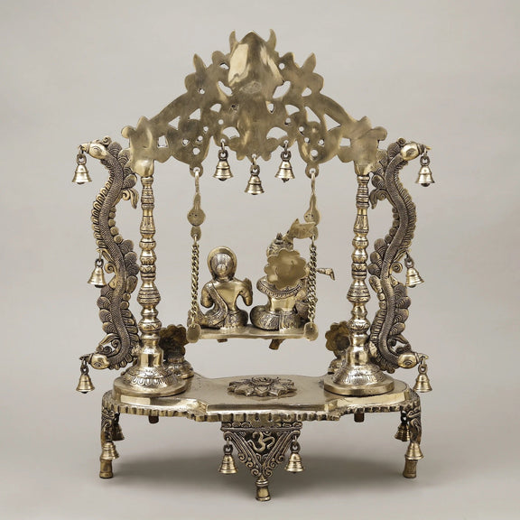 Celebrate divine love with this exquisite Brass Radha & Krishna Jhula, standing 26.5 inches tall. Crafted to embody the eternal bond of Radha and Krishna, this beautifully detailed swing adds a sacred, loving touch to any space. Perfect for adorning your home altar or living area, it inspires peace and devotion while bringing a timeless spiritual elegance to your décor.