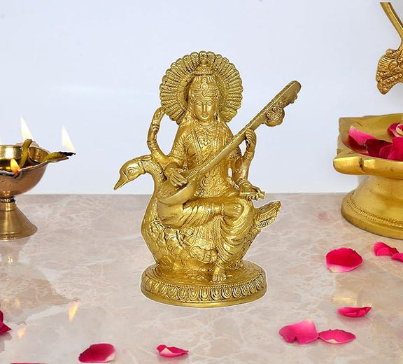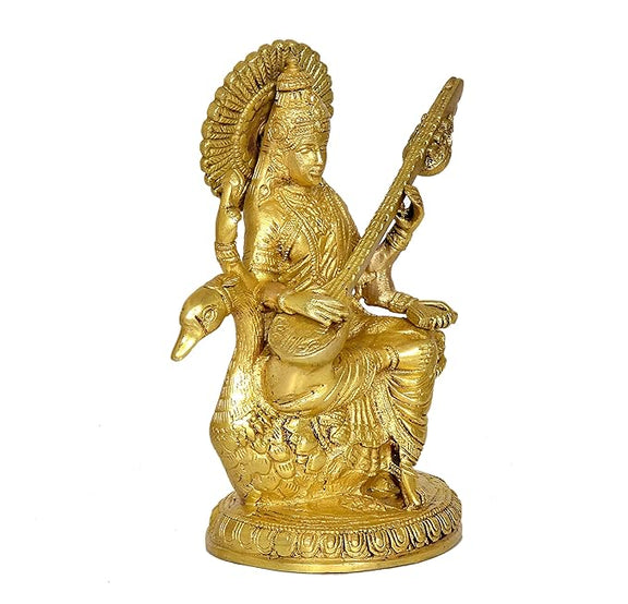 Brass Saraswati Idol On Swan Murti (Height : 8.5 Inches) Golden