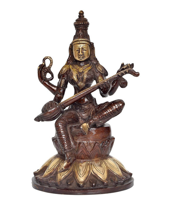 Brass Saraswati Seated on Lotus - Handcrafted Hindu Goddess Saraswati Idol for Home Decor and Pooja (Height 10 Inch)