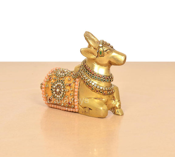 Bring home the divine presence of Nandi, Lord Shiva's sacred vehicle, with this handcrafted brass idol. This detailed statue shows a serene Nandi in a resting pose. It features intricate gemstone embellishments that add color and sparkle. This Hindu religious idol is perfect for your home temple, living room, or office. It is more than just a decorative piece; it symbolizes strength, peace, and devotion. Made from high-quality brass, it has a polished golden finish that highlights its elegant design. Whether you want a unique spiritual gift, a centerpiece for your Pooja room, or a beautiful piece of Indian home decor, this Nandi statue is an excellent choice. Its durable construction ensures it will be a cherished part of your decor for years to come.
