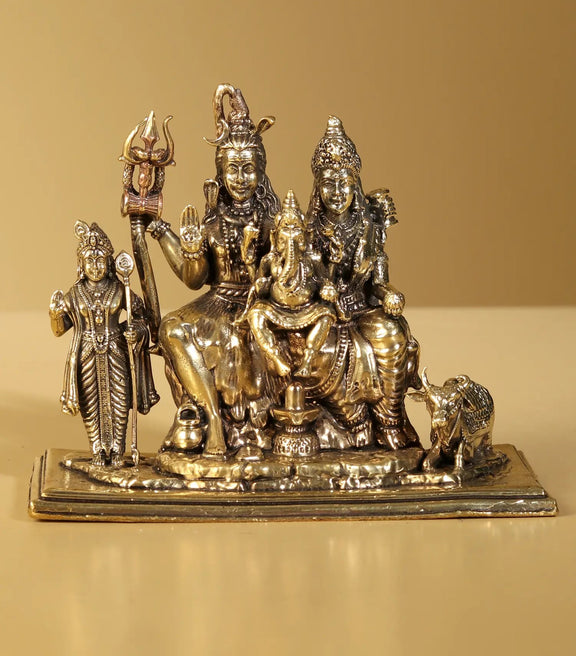 Introducing our stunning 4-inch Brass Superfine Idol of Shiva Family. Hand-crafted with intricate details, this idol showcases the powerful and divine family of Lord Shiva. Perfect for home decor, meditation, and worship, this masterpiece brings peace, prosperity, and blessings to your life. Bring home the divine energy today!