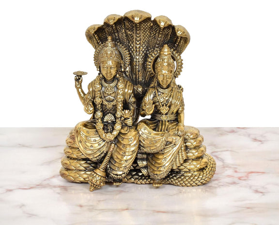 Celebrate divine love and prosperity with this exquisite 5.5-inch bronze statue featuring Maa Lakshmi seated gracefully alongside Lord Vishnu on the majestic Sheshnag idol. This beautifully crafted piece radiates warmth and blessings, perfect for bringing harmony and abundance into your home or prayer space. Its detailed design reflects devotion, making it a cherished symbol of faith and togetherness.