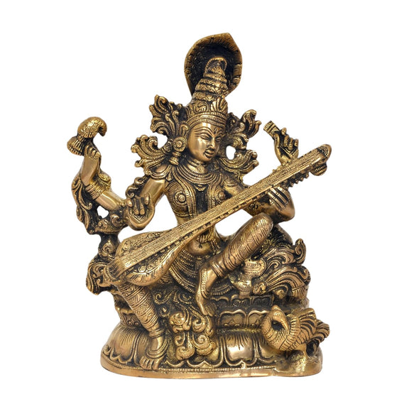Brass Maa Saraswati Statue - Handcrafted Hindu Goddess Saraswati Idol for Home Decor and Pooja (Height 11 Inch)