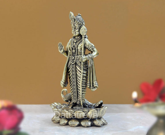 Add a divine touch to your home with our exquisite Bronze Standing Lord Kartikeya Murugan Murti. Featuring intricate details and a height of 6 inches, this decorative showpiece is perfect for home decor and pooja mandir. Bring prosperity, protection and wisdom to your home with this beautiful bronze murti