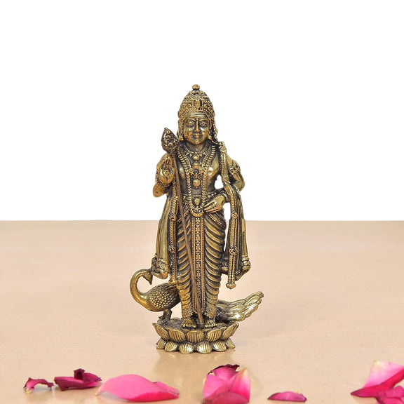 Elevate your home decor with our exquisite Bronze Lord Kartikeya figurine. Standing tall at 4.5 inches, this Murugan Murti is intricately detailed and features a majestic peacock. Crafted from premium bronze, this piece is a symbol of strength, power, and beauty - making it a perfect addition to any luxury setting.