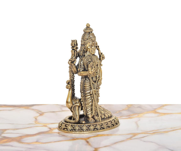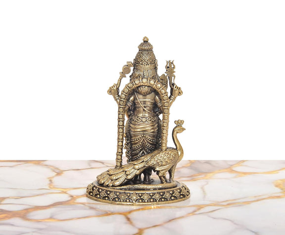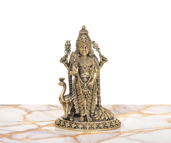 Embrace the divine grace of Lord Kartikeya with this exquisite bronze murti, a cherished representation of Murugan, the beloved deity of wisdom and courage. Standing at 6 inches, this intricately crafted statue captures the essence of spiritual devotion with its detailed peacock companion, symbolizing beauty and protection. Perfect for your home altar, meditation space, or as a meaningful gift, this bronze masterpiece invites blessings and positive energy into your sacred sanctuary. A timeless treasure for those seeking to deepen their spiritual connection.
