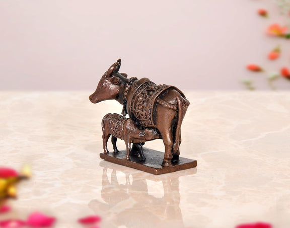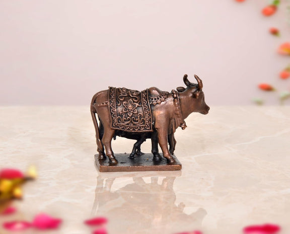 Copper Cow with Calf Pooja Mandir Home Decor (Height 2 Inch)