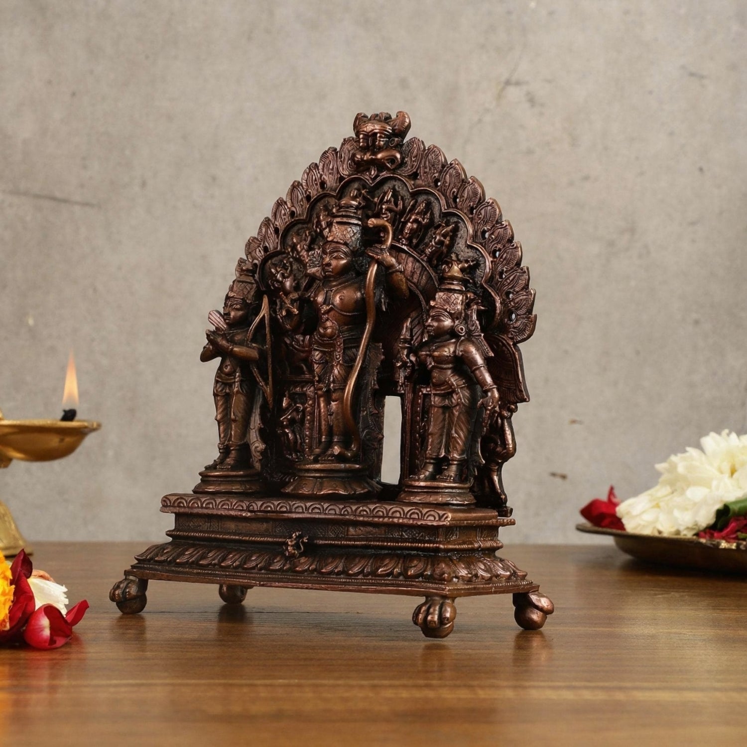 Explore our exquisite Pure Copper Ram Darbar Idol, a divine masterpiece depicting Lord Rama, Goddess Sita, Lakshmana, and Lord Hanuman. Crafted with precision and devotion, this idol radiates purity and spiritual grace, making it a perfect addition to your home temple or sacred space.