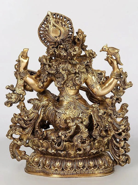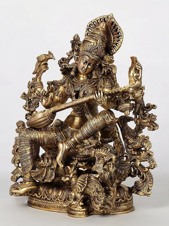 Four-Armed Saraswati Playing Veena in Brass | Handmade | Height 43 cm