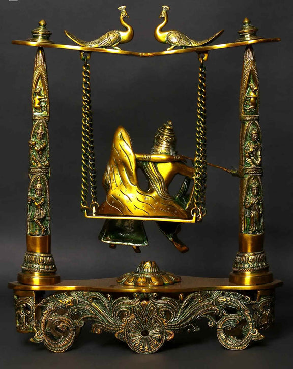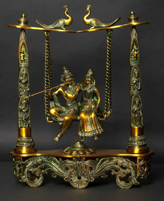 Greenish Gold Brass Statue of Radha Krishna on a Peacock Swing 18 Inches