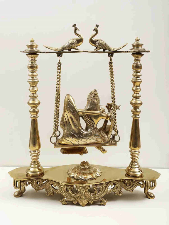 Handmade Brass Statue of Radha and Krishna on a Peacock-Perched Swing 15 inches