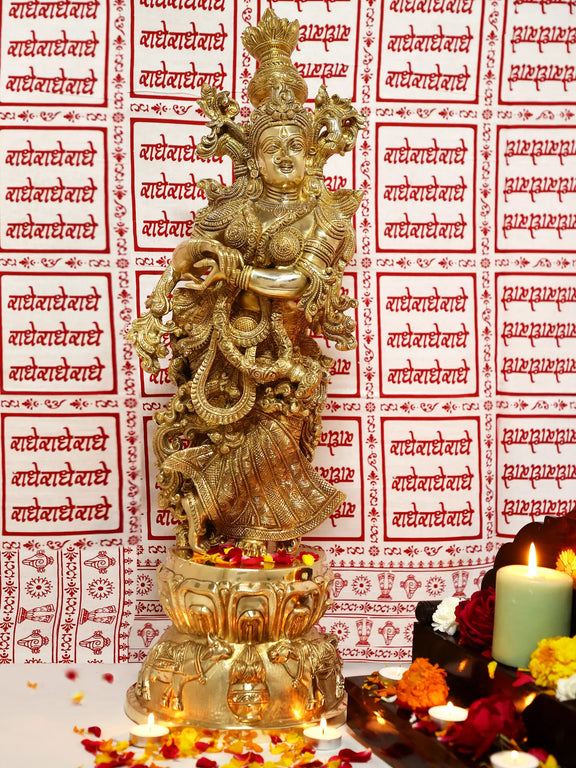 Experience the beauty and devotion of the Handmade Brass Statue of Radha Rani. This stunning 29 inch statue is intricately crafted by dedicated artisans and showcases the divine grace of Radha. Adorn your home with this masterpiece and feel the love and peace it brings.