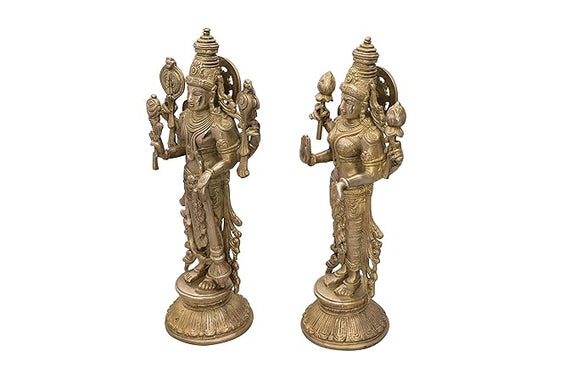 Embrace the divine with our Indian Lord Vishnu and Maa Lakshmi Standing Statue Decorative Showpiece. Crafted from brass and standing at 13 inches tall, this elegant piece adds a touch of opulence to any space. Let the blessings of Vishnu and the grace of Lakshmi elevate your home decor.
